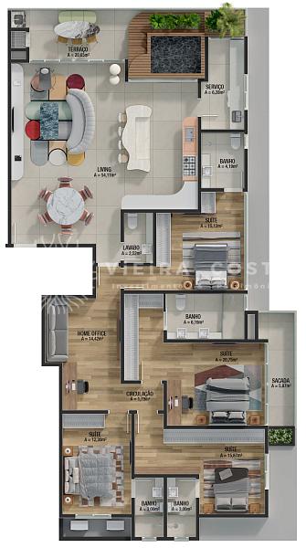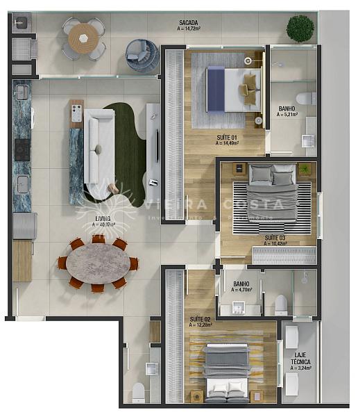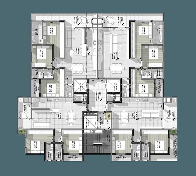 • Final 01 e 02: 01 suíte + 02 dem-suites, com 121,22 m² e 02 vagas de garagem