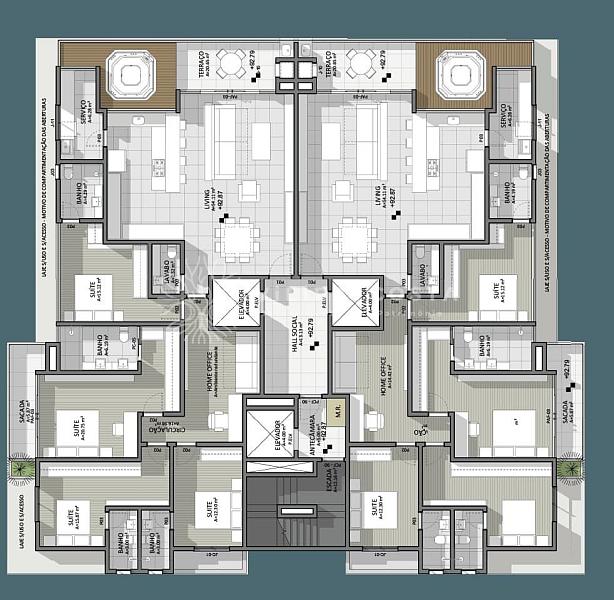 • Coberturas com 4 suítes, com 215,13 m² privativo, 03 vagas, terraço com jacuzzi e churrasqueira a carvão.